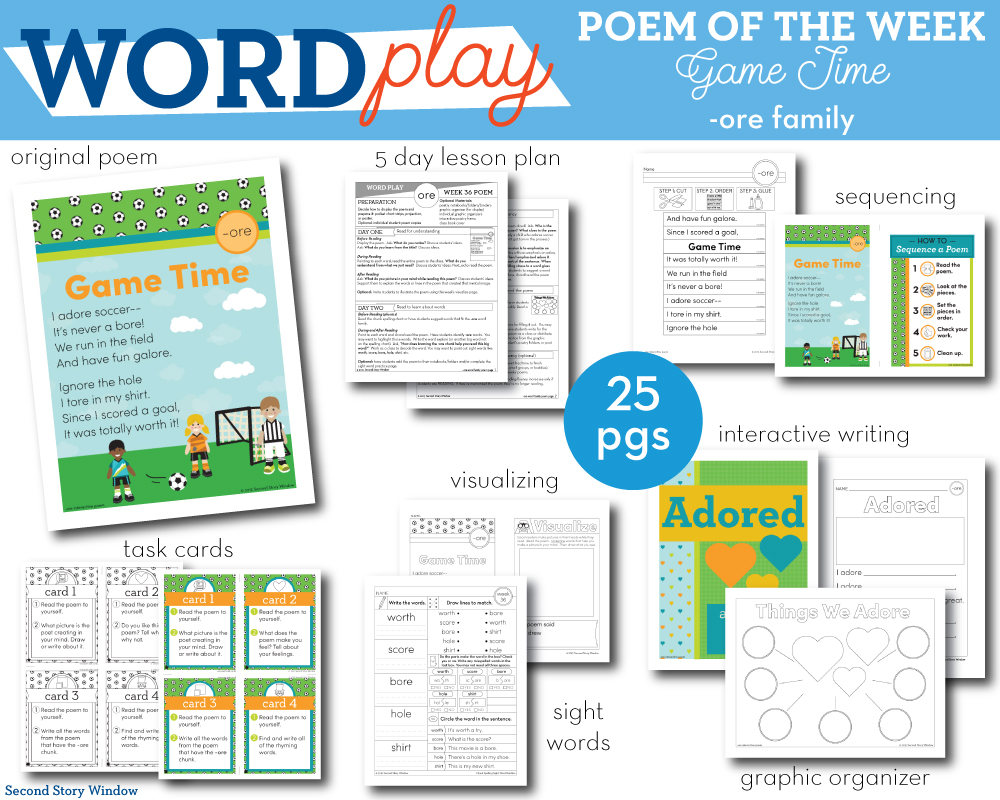 ore Word Family Poem of the Week. Practice important phonics concepts and build fluency with original weekly word family poems! Game Time is an engaging original poem with week long lesson plan and coordinating activities for the -ore word family.