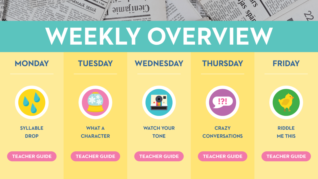 Friday – Riddles: Fluency and inferencing skills are applied as students practicing reading—and then solving—seasonal riddles. Spoiler alert: Set in a chicken coop on the farm, your students will love these spring riddles that enter the scene with two newly hatched chicks!