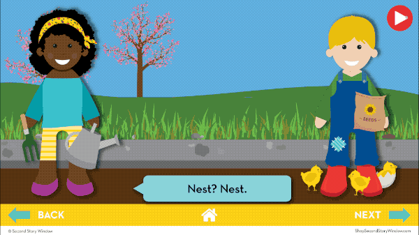 Monday – Syllable Segments: Students work with multi-syllable words to practice the word attack strategies of segmenting and blending. Syllables slide in on raindrops before a tractor (driven by a friendly pig!) reveals the whole word.